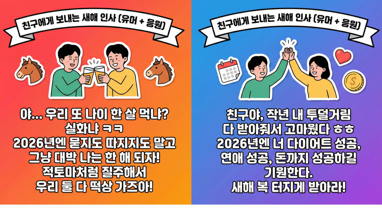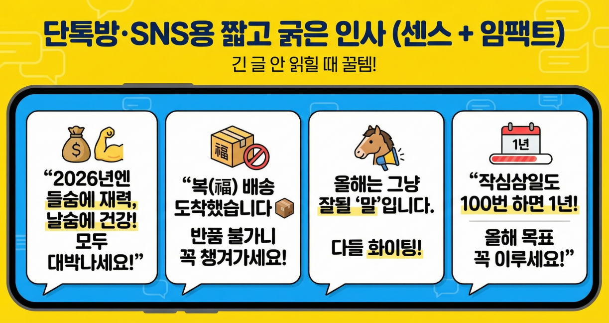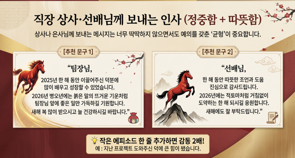 그래서 오늘은 2026년 병오년(붉은 말의 해) 의미를 반영한대상별·상황별 새해 인사말을 정리해 드립니다. 마음에 드는 문구 복사해서 바로 보내시면 됩니다!
