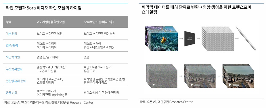 - 오픈AI의 Sora는 이를 영상용으로 확장한 ‘확산 트랜스포머 모델’을 채택