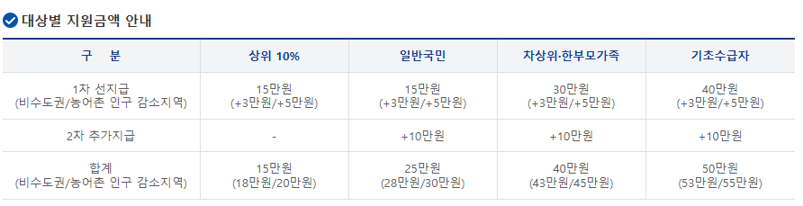 - 지급액 : 1인당 10만 원 (일반국민·차상위·한부모·기초수급자 동일)