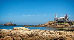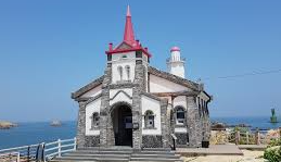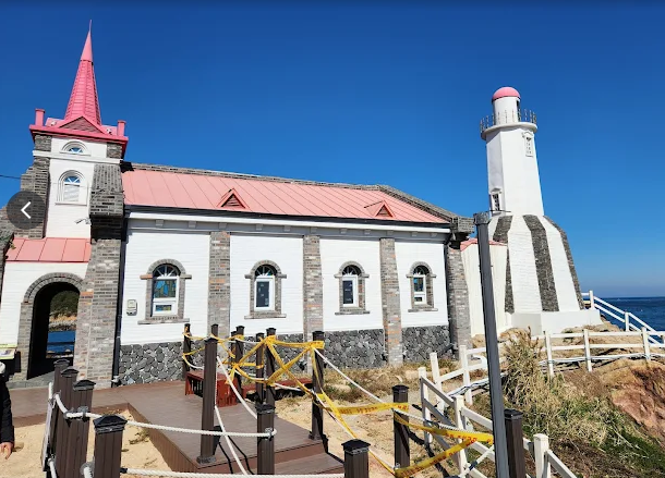 붉은 지붕의 작은 성당이 절벽 위에 서 있어 마치 유럽 해안 도시의 풍경 같아요.