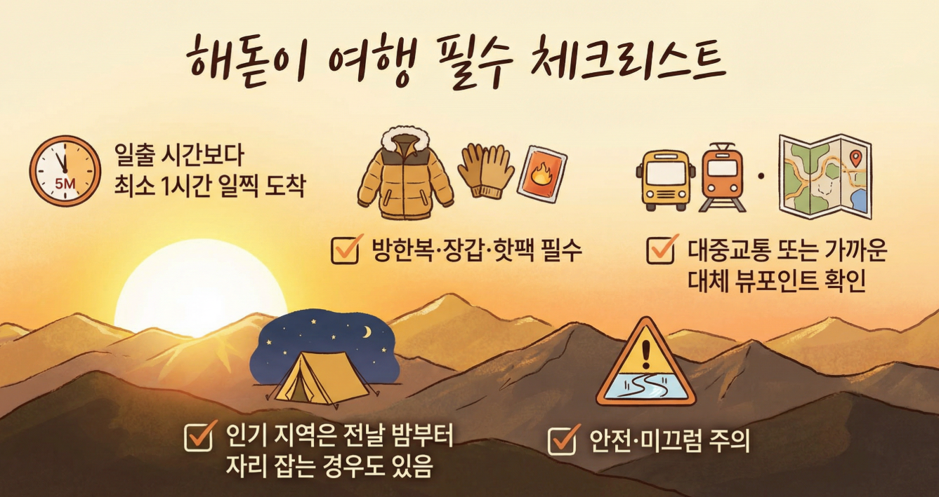 | 1 | 포항 호미곶 해맞이광장 | 한반도에서 가장 먼저 해 뜨는 명소 | 07:34 | 넓은 광장 덕분에 자리 확보가 비교적 쉬움 |